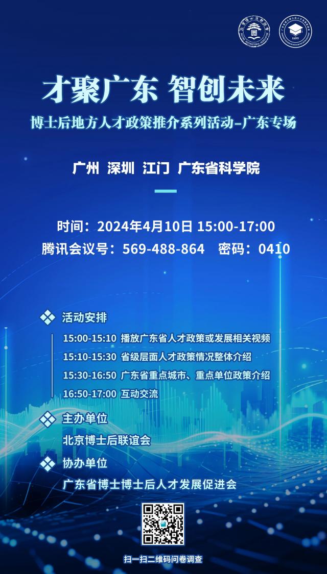 为加强对博士后青年人才的创业就业服务,帮助广大博士后充分了解各地人才政策,北京博士后联谊会将和有关地方联合,陆续开展各地人才政策推介活动。4月10日下午15:00-17:00将举办广东专场推介活动,欢迎广大博士后朋友收听收看。