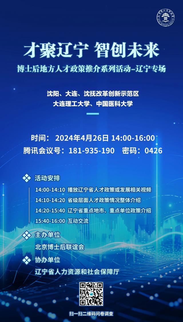 为加强对博士后青年人才的创业就业服务,帮助广大博士后充分了解各地人才政策,北京博士后联谊会联合有关地方,开展地方人才政策推介系列活动。4月26日下午14:00-16:00将举办第四场--辽宁专场推介活动,欢迎广大博士后朋友收听收看。